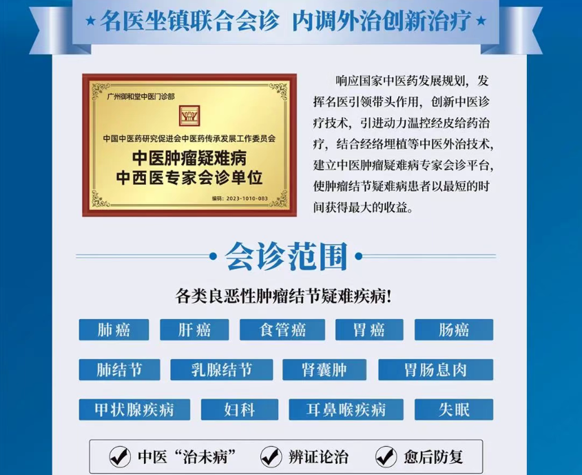 会诊优势 01内调外治创新治疗,攻克疑难疾病御和堂创新融合动力温控经皮给药与经络埋植等中医外治技术,结合精准中药内调,形成“温和无创、直达病灶”的特色诊疗新模式。该技术突破传统治疗局限,随治随走、安全高效,显著提升肿瘤、结节及慢性病疗效。同时,坚持“一人一方”个性化治疗,针对体质辨证施治,让患者享受绿色、无痛、精准的中医康复体验,真正实现疑难疾病的科学攻克! 02京粤名医强强联合,精准诊疗由北京中医名家陈爱玲主任领衔,汇聚国务院津贴专家梅广源教授、广东省中医泰斗容锦泰、国医大师弟子洪国军等权威专家,组成实力专家团。通过全方位评估,制定精准高效的个性化方案,让疑难病患者在更短时间内得到合理、有效、经济的治疗方案,避免因病情复杂辗转求医。。 03健康福利限时放送①惠民会诊:活动期间专家挂号费25元起,享免费中医体质辨识+健康指导;②治疗优惠:健康享不停,中医外治特色公益援助,针灸/推拿/拔罐等理疗项目5折体验;③贴心服务:免费中药代煎及快递配送服务。 04便捷的预约和就诊流程患者可以通过网络快速预约,无需排队,大大节省了就诊时间。同时,广州御和堂中医提供全方位的服务,从挂号、咨询、检查到治疗、康复,每一个环节都力求让患者满意。